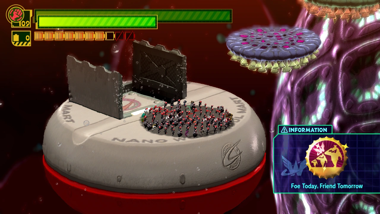 The Bottle-Cap achievement Foe Today, Friend Tomorrow requires you to recruit 500 enemies in order to be unlocked: if that sounds like a lot to you, then don't worry, because this achievement appears to be heavily glitched and seems to count enemies multiple times when they're recruited, such that you only actually need to recruit roughly 200 enemies to earn it. Furthermore, enemies that are already in your team will also be counted again each time the game is reloaded. This behavior can be most easily observed any time the Guyzoch are on your team, such as in Operation 007-A, by simply reloading the level: once you return to the level, every single member of the Guyzoch will be counted again, making it possible to rack up "500" enemy recruits simply by reloading the level repeatedly.