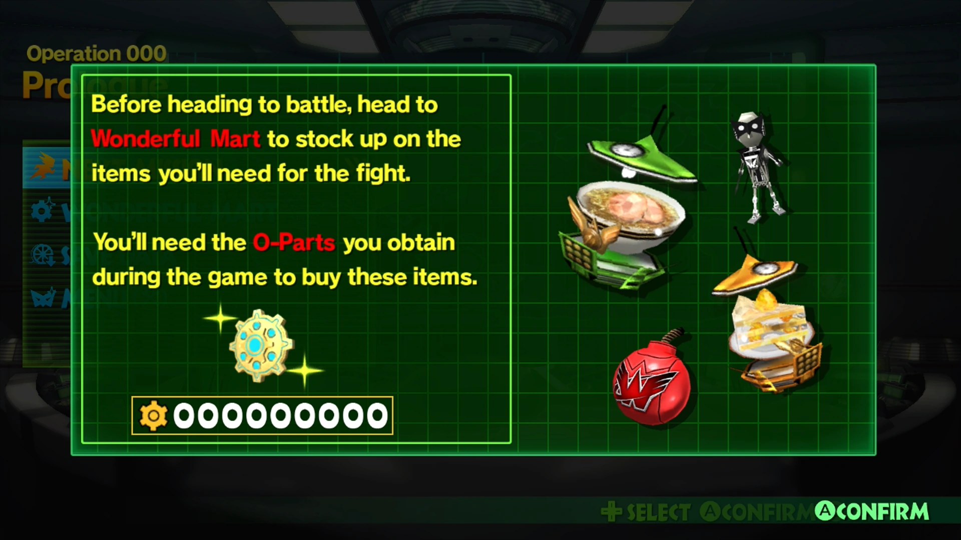 Consumable items, Custom Blocks, Unite Morphs, and Skills can be purchased from the Wonderful Mart using O-Parts as currency. Consumables can also be mixed using a combination of Space Vegetables from the MIXER section of the pause menu.