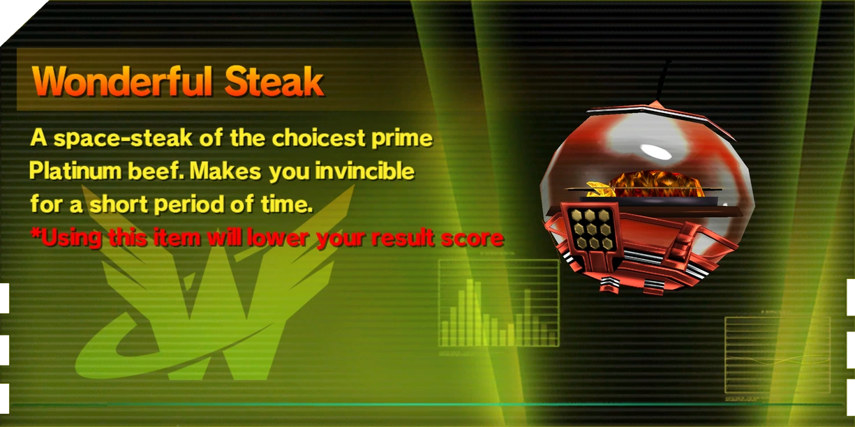 Wonderful Steaks are special healing items that fully restore your Vitality Gauge and also make you invincible for 20 seconds when used. They can be purchased from the Wonderful Mart, found well-hidden in some levels, or mixed using 30 Space Peppers and 10 Space Eggplants.