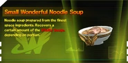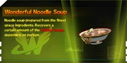 Wonderful Noodle Soups are the game's main healing items. There are actually 6 varieties of Wonderful Noodle Soup in total: Small, Normal (referred to in-game as simply "Wonderful Noodle Soup"), and Super, and each of these three portion sizes also come in To Go forms.