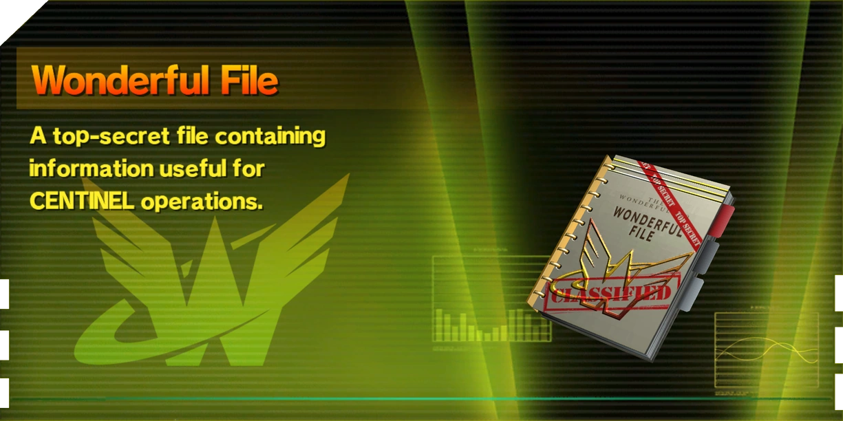 Wonderful Files are special documents providing background information on the game's main characters, details on various pieces of CENTINELS technology, and other topics. Wonderful Files don't generally provide information that is useful to gameplay, but they can be an interesting read nonetheless. Some Wonderful Files are also updated with new information as the game's story progresses. Wonderful Files can be found hidden in almost every level of the game.