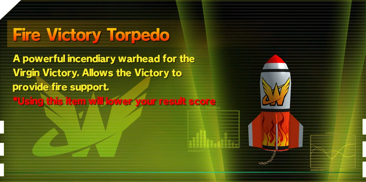 Fire Victory Torpedoes are combat items that can be used to bombard the on-screen area with incendiary missiles, dealing damage to enemies and engulfing them in flames. They can be purchased from the Wonderful Mart, found well-hidden in some levels, or mixed using 10 Space Peppers, 30 Space Carrots, and 20 Space Eggplants.