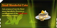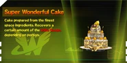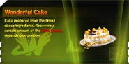 Wonderful Cakes are energy restoration items that can be used to restore the Unite Gauge. Like Wonderful Noodle Soups, there are actually 6 varieties of Wonderful Cake in total: Small, Normal (referred to in-game as simply "Wonderful Cake"), and Super, and each of these three portion sizes also come in To Go forms.