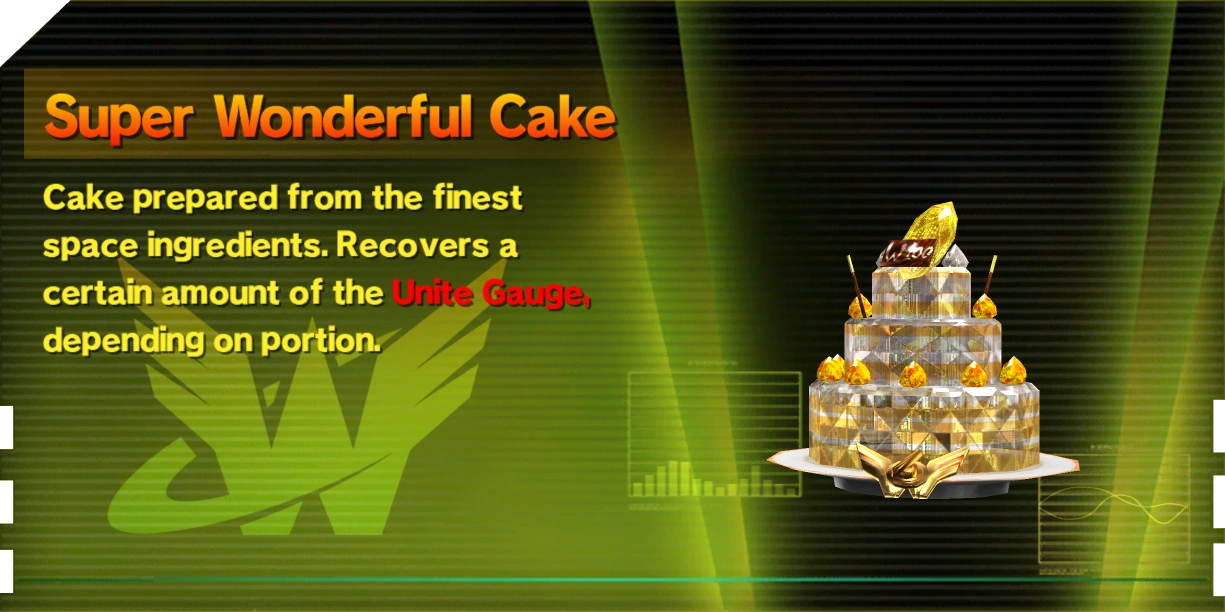 Wonderful Cakes are used automatically when picked up to restore units of the Unite Gauge depending on the item's portion: Small Cakes restore 1 unit, Normal Cakes restore 3 units, and Super Cakes restore 6 units. Wonderful Cakes are almost exclusively found by breaking objects.
