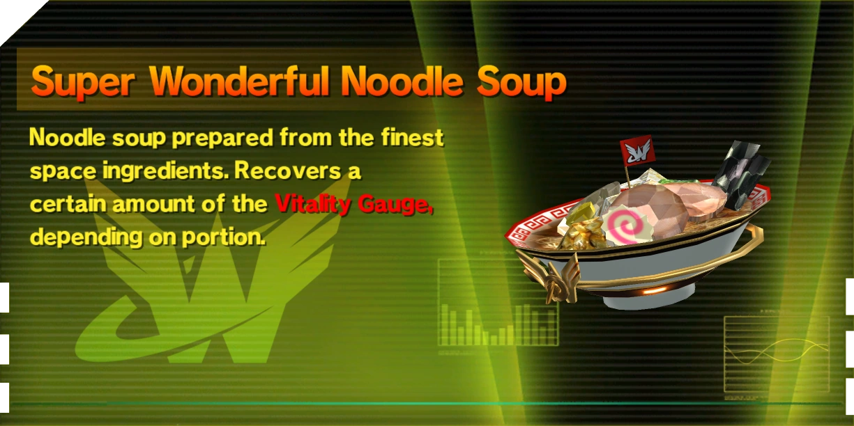 Wonderful Noodle Soups are used automatically when picked up to restore the Vitality Gauge by an amount depending on the item's portion: Small Soups restore a set amount equivalent to 1/16 of the largest Vitality Gauge, Normal Soups restore 1/8, and Super Soups restore 1/4. Wonderful Noodle Soups are almost exclusively found by breaking objects, and are more likely to appear at low health.