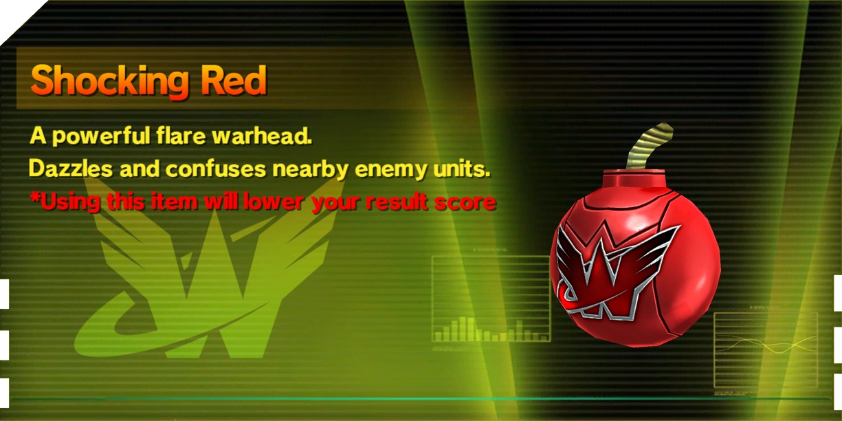 Shocking Reds are combat items that can be used to instantly stun all enemies, as if their attacks had just been blocked using Unite Guts. They can be purchased from the Wonderful Mart, found well-hidden in some levels, or mixed using 10 Space Peppers, 10 Space Carrots, and Space 10 Eggplants.