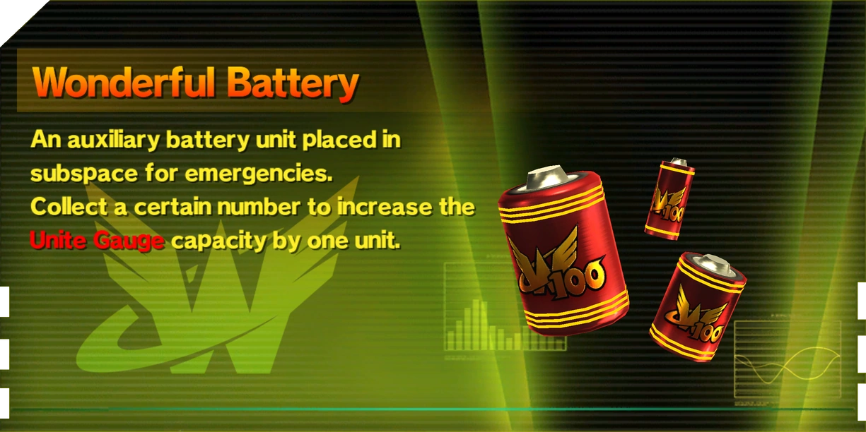Wonderful Batteries are special items that are found scattered throughout every non-boss level of the game. They can be collected to increase the Unite Gauge's capacity past its initial limit of 5 Units, up to a maximum of 10 Units.