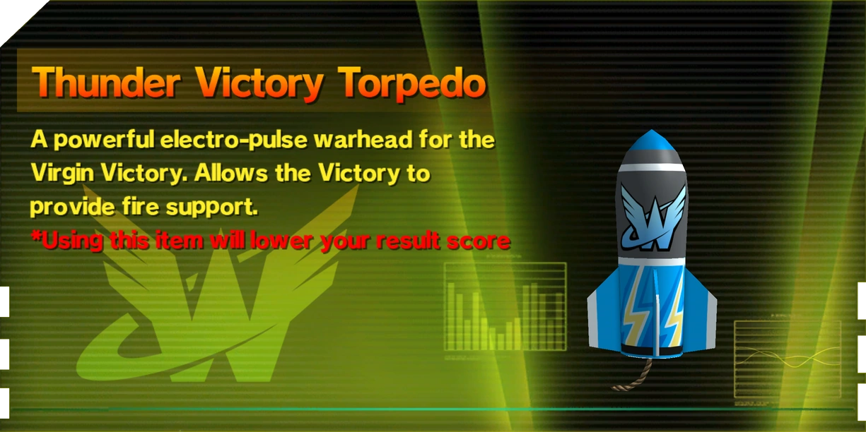Thunder Victory Torpedoes are combat items that can be used to bombard the on-screen area with electrical missiles, dealing damage to enemies and briefly freezing them in the same "hit-stop" effect as an electrified Unite Sword. They can be purchased from the Wonderful Mart, found well-hidden in some levels, or mixed using 30 Space Peppers, 10 Space Carrots, and 20 Space Eggplants.