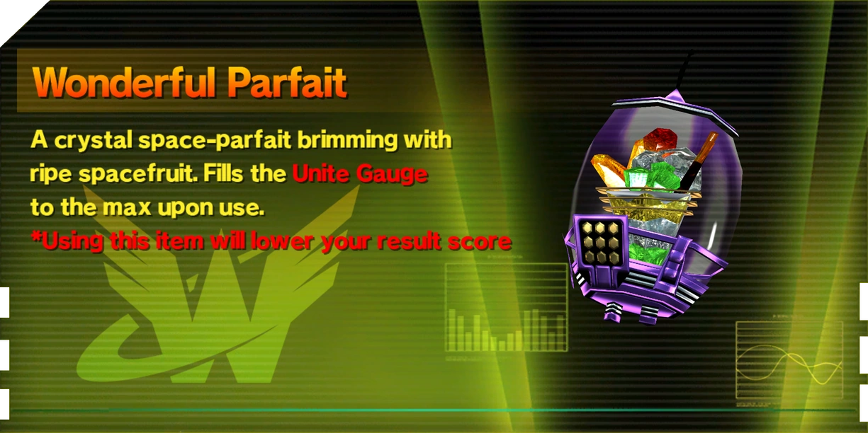 Wonderful Parfaits are special energy restoration items that fully restore your Unite Gauge and provide you with infinite Unite Energy for 20 seconds when used. They can be purchased from the Wonderful Mart, found well-hidden in some levels, or mixed using 20 Space Carrots and 10 Space Eggplants.