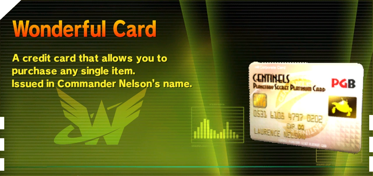 Wonderful Cards are unique consumable items that can only be obtained by mixing 30 Space Peppers, 30 Space Carrots, and 30 Space Eggplants (the maximum that can be mixed at once.) A Wonderful Card can be spent instead of O-Parts to purchase items from the Wonderful Mart.
