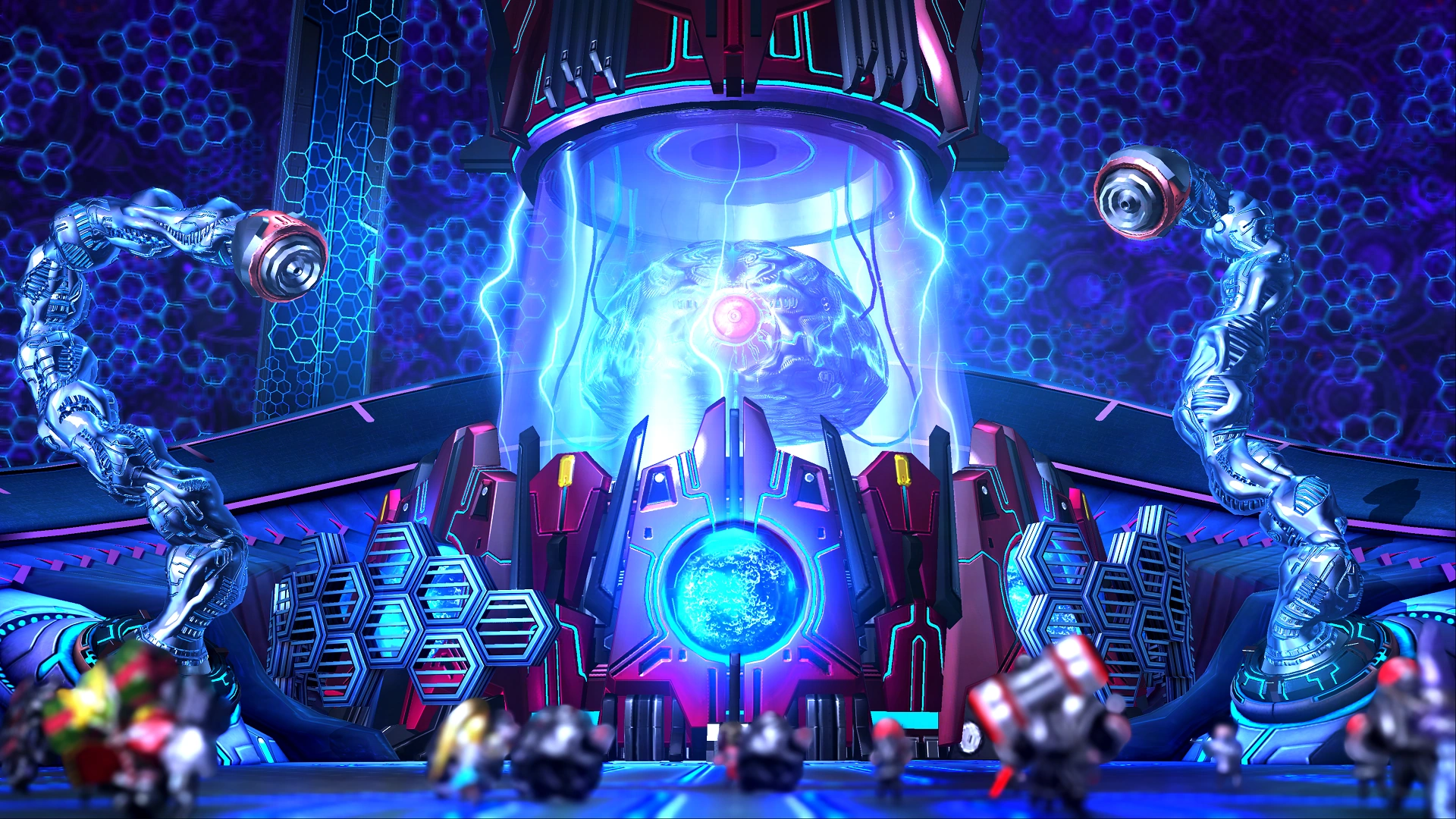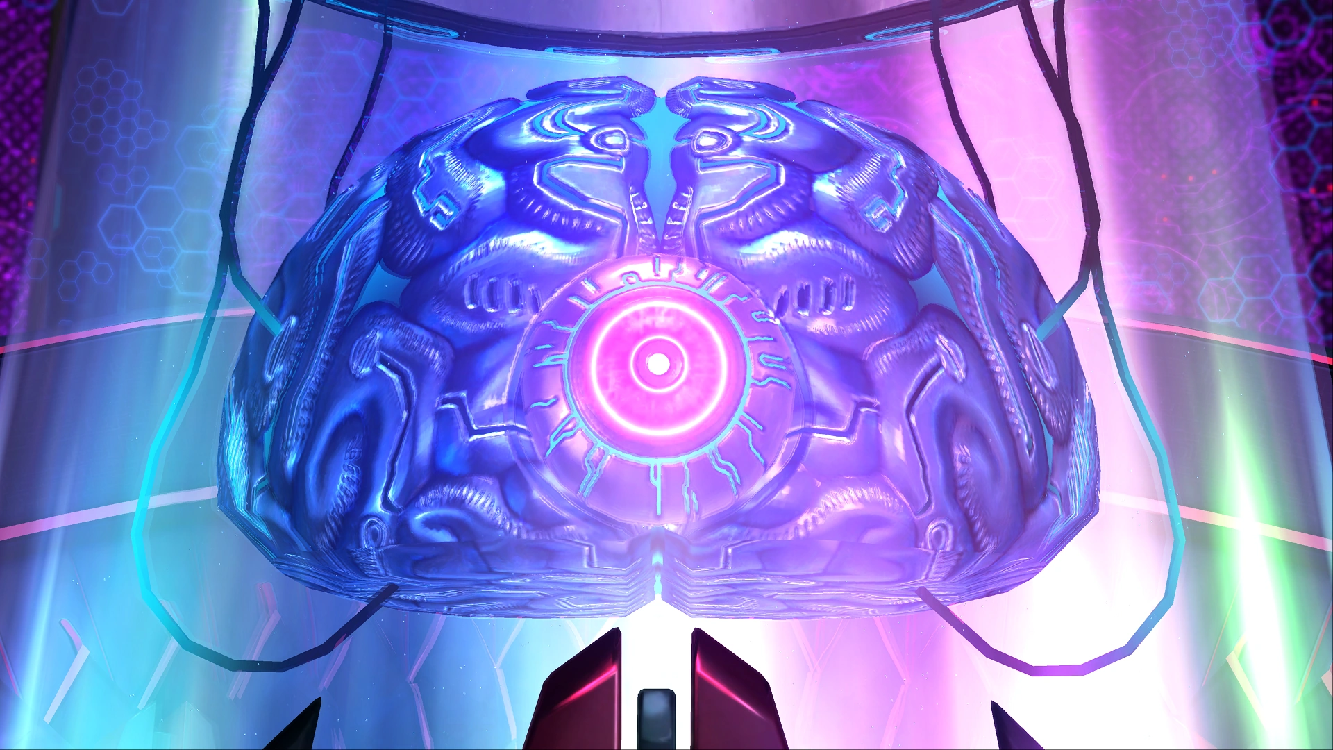 What could be considered his most basic form, The Machine World Jergingha refers to the Jerk-matter reactor and supercomputer at the heart of GEATH-Wahksay. In this form, Jergingha is a gigantic electronic brain, with a metallic blue surface covered in glowing blue lines that pulse across its surface. At the front of his brain is a black metal eye ball resembling GEATH-Wahksay itself, with glowing lines that give a bloodshot appearance, a red/pink iris, and a black pupil with a glowing blue ring at its center.